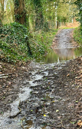 Après avoir quitté le bourg, nous longeons un ancien lavoir et nous prenons le sentier du Vieil Étang. En sortant de la vallée, nous montons un chemin creux qui date de l'époque gallo-romaine. Problème ? Impossible de continuer.