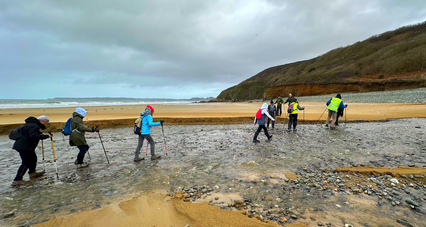 A marée basse, nous foulons une longue plage de sable fin.